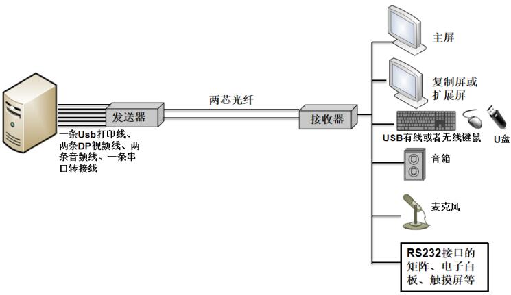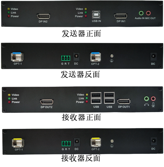 本產品為成套設備一對組成,其中一個為發(fā)送器(標有Sender字樣),一個為接收器(標有Receiver字樣);能通過兩條光纖把兩路DP視頻、一路獨立音頻、一路麥克、四路USB2.0延長到遠端,并且還可以同時傳輸RS232串口信號,用于與觸摸屏、云臺、電子白板等設備控制的遠距離傳輸,最遠傳輸距離20千米,用戶可以在遠端控制使用計算機,圖像效果清晰自然,支持分辨率高達4K×2K。